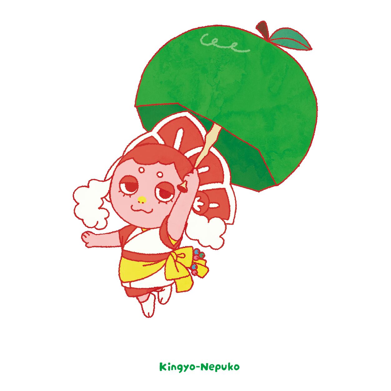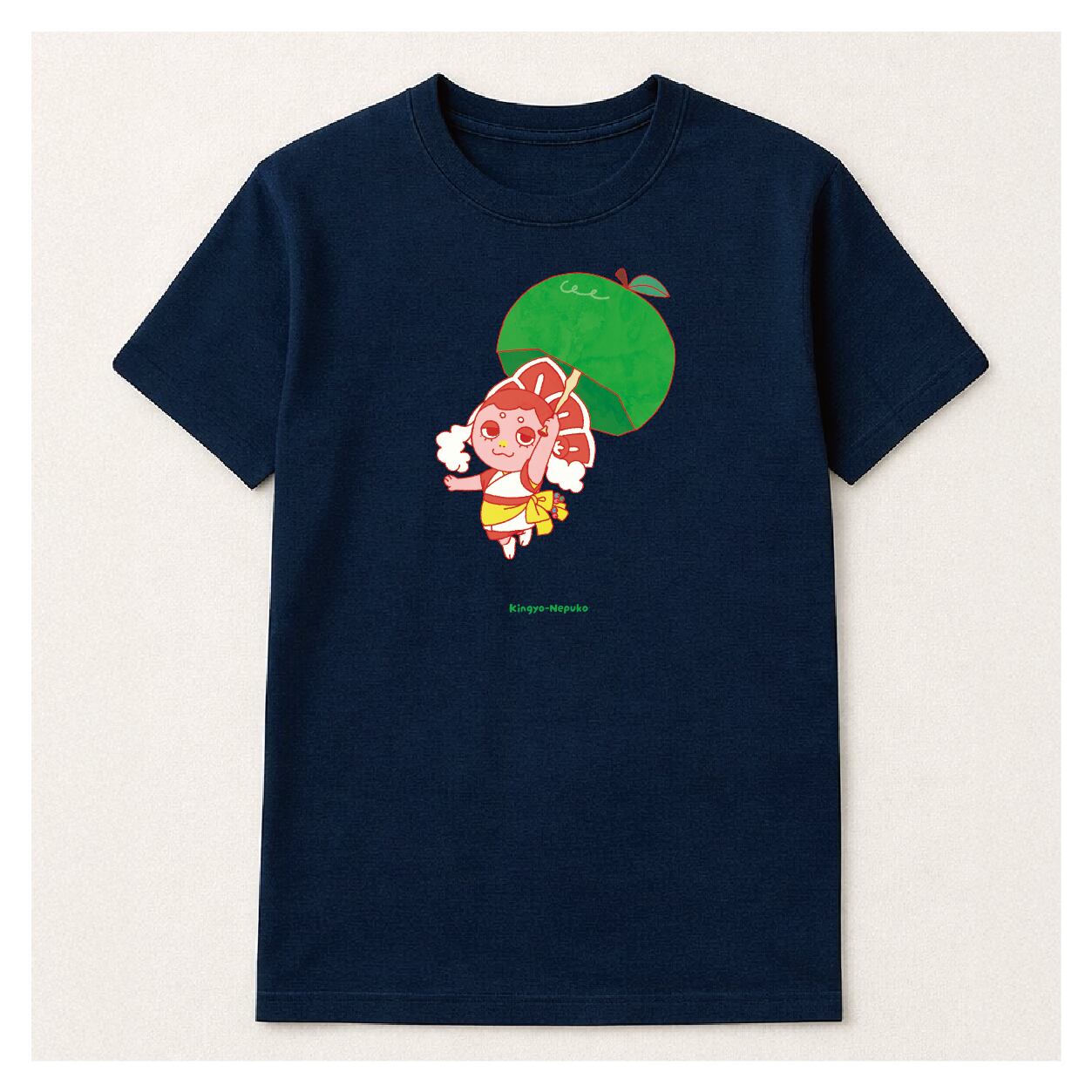 オリジナルキャラクター 金魚ねぷたの女の子、きんぎょねぷこのTシャツです。 青りんごの傘を持ってお出かけしています♪
